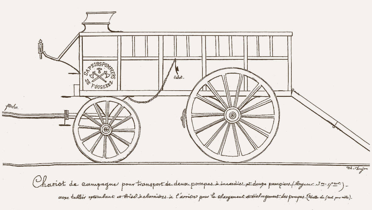 Fougères, à cette époque n’était pas munie de corps de sapeurs pompiers. Il faudra, en effet, attendre 1764 pour que la Communauté de Ville décide d’acheter du matériel incendie qui consista en deux pompes que l’on fit venir de Rouen, et en 200 seaux en osier qui furent godronnés à Fougères et fournis par le sieur Pestour de Rennes. Quant aux artisans locaux, ils furent chargés de confectionner câbles et échelles. L’entretien de ce matériel fut confié à Jean Claude Lambert, de Dol, que l’on dit être une personne intelligente et expérimentée